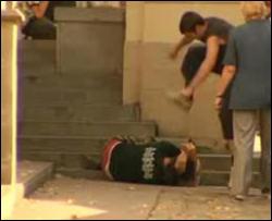 На площі Ринок, в самому центрі міста, прямо під балконом робочого кабінету мера серед білого дня один хлопець жорстоко бив іншого. Відеоролик розправи з"явився на youtube і в ЖЖ. На ньому виразно видно, як на хлопця, який лежить на бруківці, стрибає розлючений чоловік і б"є бідолаху ногами по голові. Лежачий спочатку закриває голову, але потім руки безвольно падають. За всім мовчки спостерігають сотні перехожих...