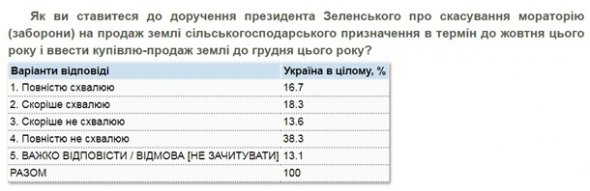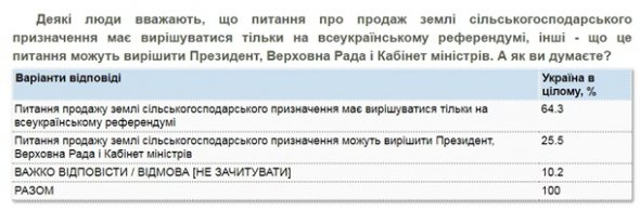 При цьому 64% українців вважають, що питання про продаж землі сільськогосподарського призначення має вирішуватися тільки на всеукраїнському референдумі, 26% вважають, що це питання повинні вирішувати президент, Верховна Рада і Кабінет Міністрів. 10% не змогли відповісти на питання.