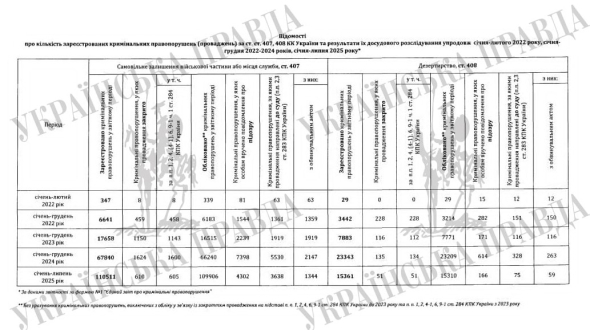 Згідно з даними у "Єдиному звіті про кримінальні правопорушення" за статтею 407 ККУ (Самовільне залишення військової частини або місця служби) у 2022 році зареєстровано 6 988 проваджень (з них 347 у період січень-лютий), у 2023 році - 17 658, у 2024-му - 67 840 проваджень.