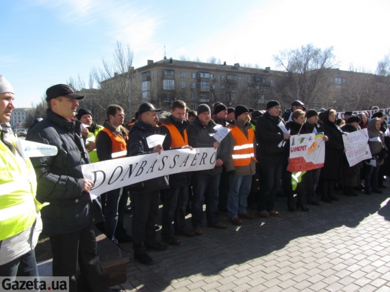 Близько 70 співробітників "Донбасаеро" мітингували 26 лютого біля стін Донецької облдержадміністрації, звертаючись до влади з вимогою втрутитися і припинити знищення авіакомпанії. Учасники акції обвинувачували олігарха Ігоря Коломойського у зловмисних діях, спрямованих на штучне банкрутство "Донбасаеро".