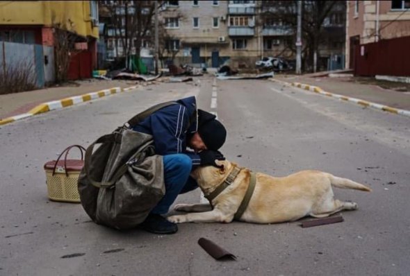 Фото чоловіка, який заспокоює собаку, паралізованого страхом після бомбардування в Ірпені, зворушило мільйони українців.