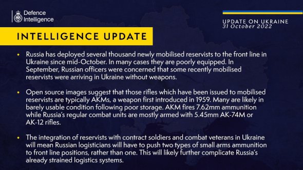 "Інтеграція резервістів з контрактниками та ветеранами бойових дій в Україні означатиме, що російським логістам доведеться доставляти на передові позиції два типи боєприпасів для стрілецької зброї, а не один. Це, імовірно, ще більше ускладнить і без того перевантажену логістичну систему Росії", – вважають у британській розвідці.
