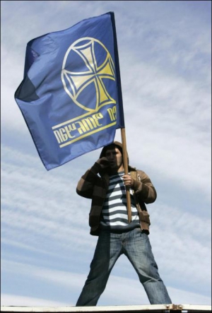 Грузин тримає партійний прапор опозиції на мітингу перед парламентом у Тбілісі в п'ятницю, 10 квітня 2009 року