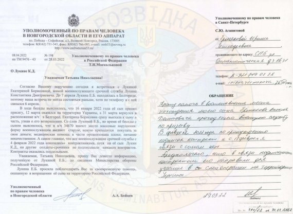"Матері російських строковиків, розуміючи невідворотність смерті своїх дітей, звертаються зі скаргами на незаконні дії командирів до уповноваженої з прав людини в Росії Тетяни Москалькової. Але у відповідь отримують чергову брехню та відписки. Поки боротьба в РФ за життя молодих росіян не стане масовою, вони й надалі продовжуватимуть безславно вмирати, виконуючи накази кремлівського диктатора", - інформує ГУР.