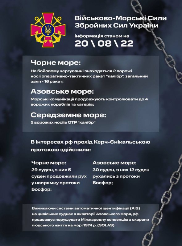 18 серпня на бойовому чергуванні в Чорному, Азовському й Середземному морях перебували 10 ворожих кораблів Російської Федерації. 19 серпня – 11 суден ворога.