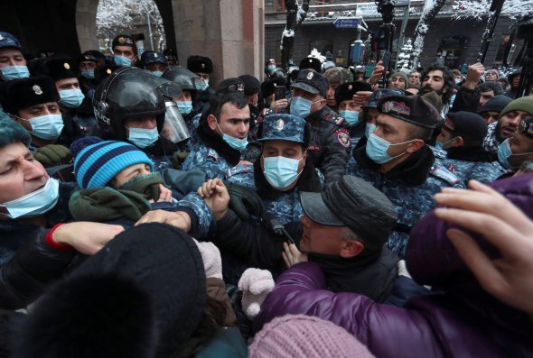 Вірменські правоохоронці біля кабінету уряду стримують учасників мітингу опозиції з вимогою подати у відставку прем'єр-міністра Ніколя Пашиняна після підписання угоди про припинення військового конфлікту навколо Нагірного Карабаху. Єреван, Вірменія, 24 грудня 2020 року.