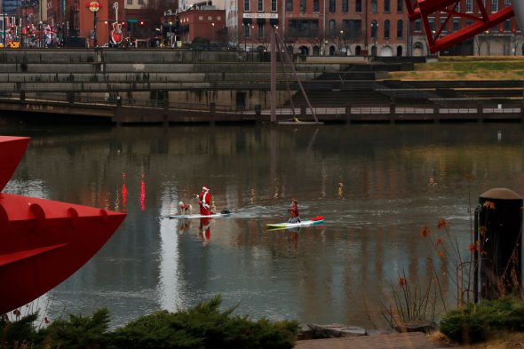 Веслувальник одягнений Санта-Клаусом на річці Камберленд у центрі Нешвіла біля стадіону "Ніссан", перед початком гри "Детройтські леви" та "Теннессі Титани" 20 грудня 2020 року в Нешвіллі, штат Теннессі.