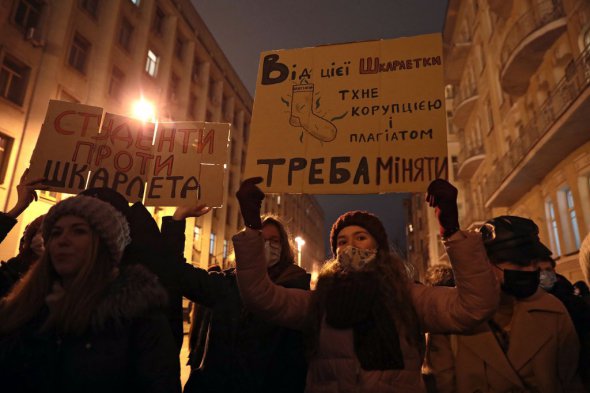 Активісти тримають плакати з вимогою негайно подати у відставку Сергія Шкарлета з посади Міністра освіти і науки України під час всеукраїнської акції протесту Зупиніть Шкарлета - не дозволяйте їм знищувати освіту. 22 грудня 2020, Офіс Президента України, вулиця Банкова, Київ.