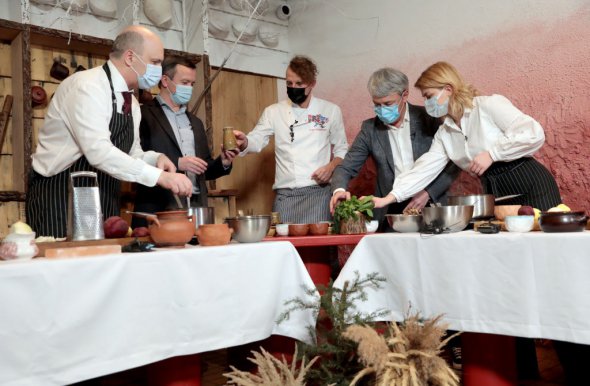 Київ, 22 грудня 2020 — Міністр захисту довкілля та природних ресурсів України Роман Абрамовський, міністр економічного розвитку, торгівлі та сільського господарства України Ігор Петрашко, керівник Інституту культури України Євген Клопотенко, міністр культури та інформації Олександр Ткаченко та віце-прем'єр-міністр з питань європейської та євроатлантичної інтеграції України Ольга Стефанишина беруть участь у заході "Кулінарний бій" на підтримку номінації "Культура приготування українського борщу" під час включення до Списків нематеріальної культурної спадщини ЮНЕСКО.