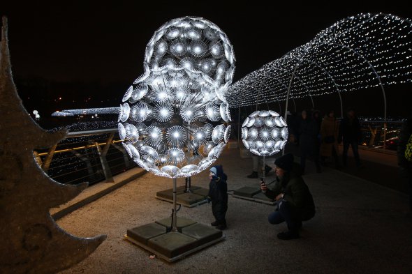 25 грудня 2020 скляний міст у парку Володимирська гірка у Києві до новорічних свят прикрасили незвичними прикрасами.