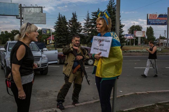 У терористичній "ДНР" жінку, яка підтримує єдину Україну, поставили до "стовпа ганьби". Момент зафіксувало видання The New York Times.