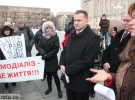 Під ці слова до площі прямує начальник управління охорони здоров'я області Леонід Брожик разом із заступником облради Василем Касьяном. Мітингувальники скептично усміхаються.