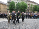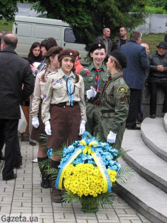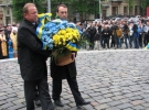 Почалося дійство із покладання міськими та обласними політиками і чиновниками квітів до пам'ятника. Спершу до постаменту стройовим кроком підійшли двоє пластунів - хлопець і дівчина. Вони піднесли великий вінок кольорів державного прапору. Уже за ними рушили усі високопосадовці, кожен із яких тримав у руках по дві однакові білі троянди. Лише голова фракції "Фронту Змін" у Львівській обласній раді приніс букет із 14 червоних троянд.