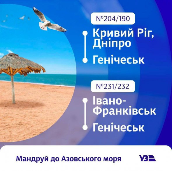 Укрзалізниця продовжує призначати нові маршрути до моря з різних регіонів України. Потяги з Кривого Рогу, Дніпра та Івано-Франківська курсуватимуть до Генічеська.