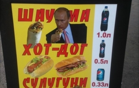 На підтвердження джерело опублікувало фотографії. На рекламній стійці російський президент зображений з шаурмою в руці (видання у зв'язку з цим зазначає, що страву до російського президента "грубо примальовували у фотошопі"). Там же зазначено, що крім власне шаурми покупцям пропонуються хот-доги і сулугуні.