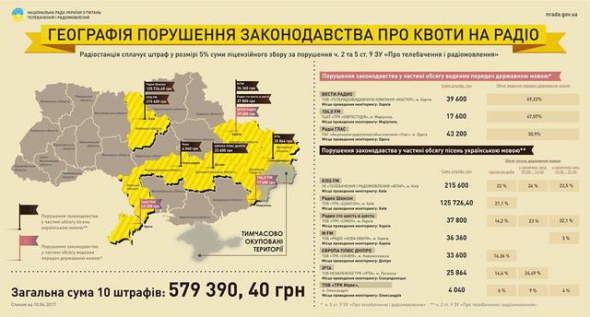 "Порушення законодавства за обсягом ведення програм українською мовою зафіксовано у "Радіо Вести", радіо 104.FM (Маріуполь) і радіо "Голос" (Одеса). За порушення законодавства в частині обсягу пісень українською мовою оштрафовані "Радіо Шансон", радіо Kiss FM, "Радіо 106,6" (Харків), MFM (Харків), "Європа Плюс Дніпро", "Ірта" (Сіверськодонецьк), "ТРК Маяк" (Олександрія)", - йдеться у повідомленні.