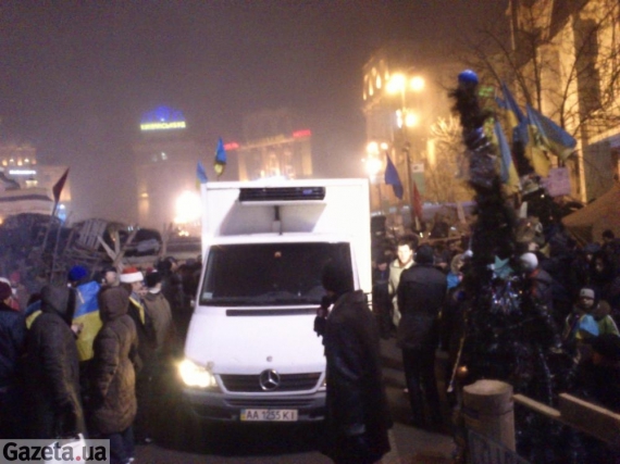 На Майдан торт привезли вантажівкою. Зараз його ріжуть на шматки і пригощають усіх охочих під сценою Євромайдану. До нього вишикувалася черга. Торт розібрали за 20 хвилин.