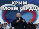 Учасники акції тримають в руках російські прапори та транспаранти із написами "Віримо Путіну", "Крим – російська земля" та інші.