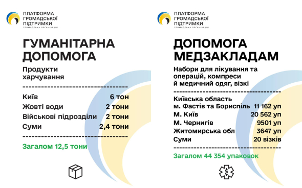 За три місяці передано понад 12,5 тон продуктів харчування у Києві, Сумах, Жовтих Водах та у військові підрозділи. Також медичні заклади у Києві, Чернігові, Житомирі, Фастові, Борисполі та інших містах отримали тисячі наборів для операцій, компреси, медичний одяг та візки. Крім того у Сумах стартував пілотний проєкт патронатної служби для поранених бійців. В його рамках проведено тренінги для медиків, а також у госпіталі передано 100 спеціальних пакетів з набором найнеобхіднішого для поранених військовослужбовців. Цей проект планують масштабувати.