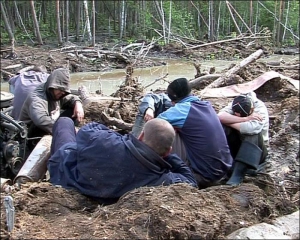Бригада старателів, затримана міліцією 19 червня цього року під селищем Клесів Сарненського району на Рівненщині. Зліва видно двигун мотопомпи. На задньому плані — яма з водою, з якої виловлювали бурштин