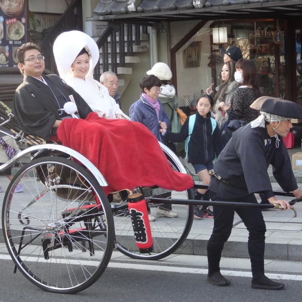 На японському весіллі прийнято переодягатися – наречена чергує вбрання, надягаючи в різний час церемонії біле і червоне кімоно. Поїздка на рикші – навіть якщо це осучаснений варіант – теж обов'язковий елемент урочистості.