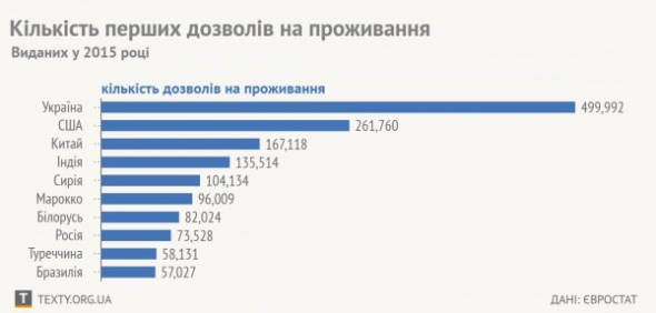 За минулий рік українці отримали найбільше посвідок на проживання у країнах Євросоюзу. На другому місці — громадяни США, далі китайці.