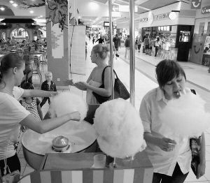 У столичному парку ім. Рильського 58-річна Людмила Козлюк продає солодку вату. До неї черга із п'яти людей: двоє студентів, троє дітей шкільного віку. Цукрова вата коштує 10 грн.