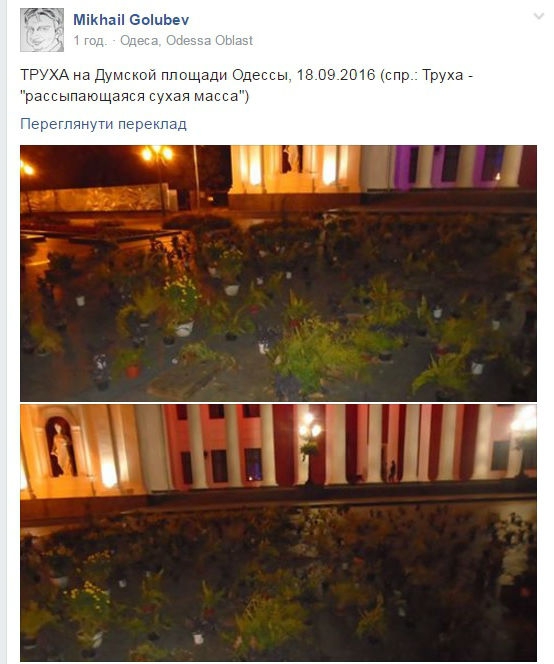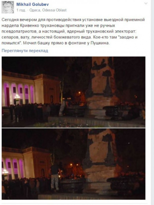 "Пригнали вже справжній ядерний труханівський електорат: сепарів, вату, особистостей бомжуватого вигляду. Дехто там "заодно і помився". Мочив голову прямо у фонтані у Пушкіна", - повідомляють активісти.
