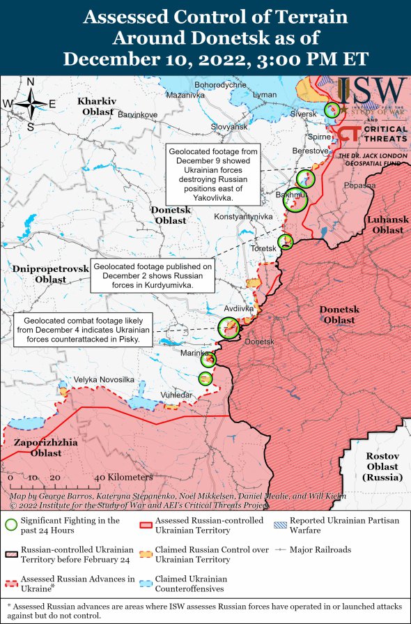 Тим часом російські загарбники не припиняють штурми на Авдіївському та Бахмутському напрямках. Про це свідчать свіжі карти бойових дій, опубліковані вранці 11 грудня Інститутом вивчення війни (ISW).