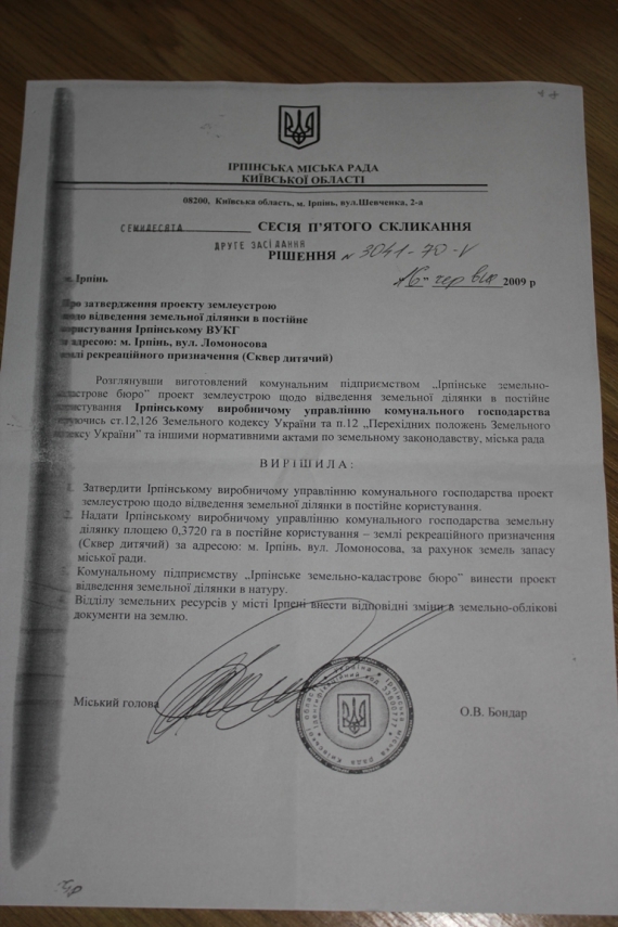 "Я подав позовну заяву до Ірпінського міського суду з вимогою скасувати рішення Ірпінської міської ради №440-10-VI від 14.04.2011 р., яким та скасувала рішення попередньої влади і перевела вісім зелених зон з розряду земель рекреаційного призначення до земель під житлову та громадську забудову", - уточнив координатор.