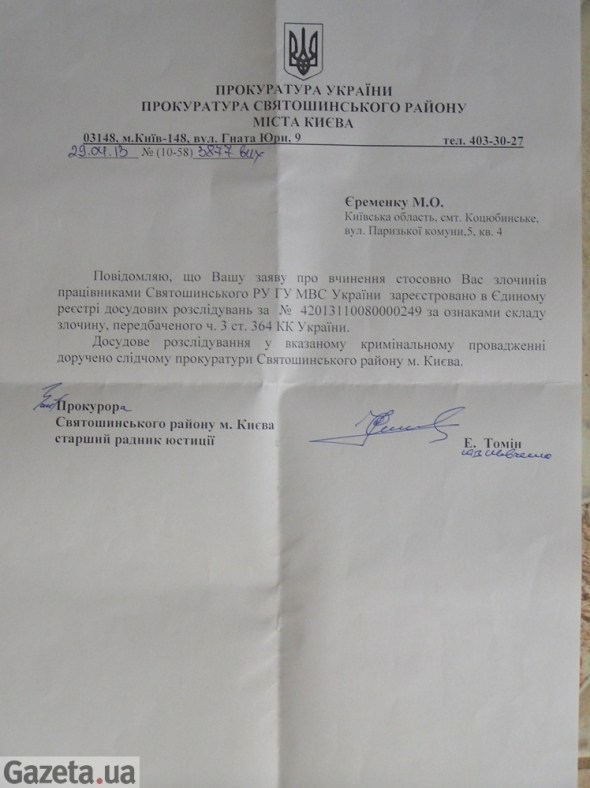 "Як і обіцяв, запускаю процес притягнення авторів моєї кримінальної справи до відповідальності, - повідомив активіст Микола Єременко. - На днях заніс до Святошинської прокуратури Києва відповідну заяву".