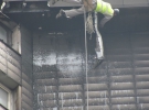 На зазнавшому пожежі будинку по вул. Гетьмана, що на Шулявській, сьогодні було демонтовано елементи згорівшого фасаду, які загрожували падінням на людей.