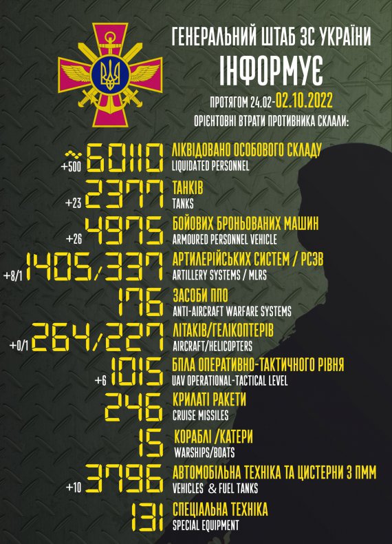 Загальні бойові втрати росіян на ранок 2 жовтня становлять 60 110 осіб.