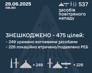 Станом на 08:30, за попередніми даними, протиповітряна оборона знешкодила 475 ворожих цілей. Зокрема, 249 цілей були знищені вогневими засобами, ще 226 - подавлені або втратили координати через засоби РЕБ.