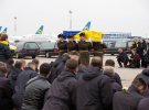 Близько 12:00 тіла загиблих із літака жалобним кортежем доставили до терміналу В. Вздовж дороги вишикувалися нацгвардійці. В аеропорту загиблих живим коридором зустрічали колеги. Пілоти стояли на колінах.