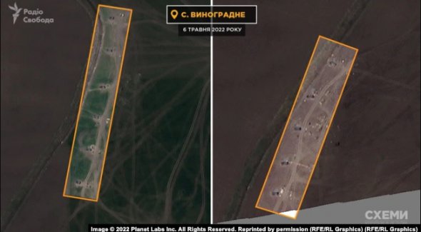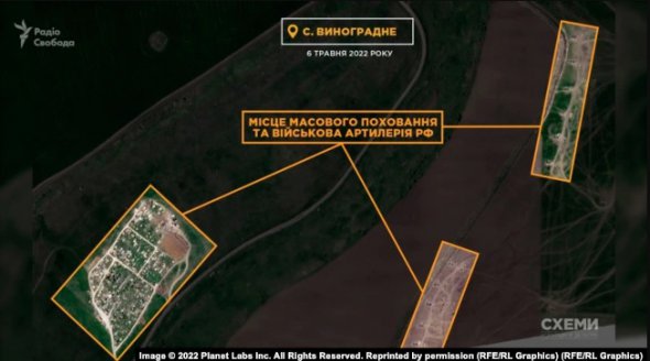 Неподалік від кладовища у селі Виноградне 6 травня супутник також зафіксував військову техніку РФ. Військові експерти, до яких звернулись журналісти, розпізнали машини артилерії.