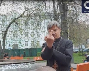 Одну дівчину священик сильно штовхнув. А на питання людей "з якої він церкви" показав середній палець, повідомляє сайт "Сьогодні" із посиланням на очевидців події.