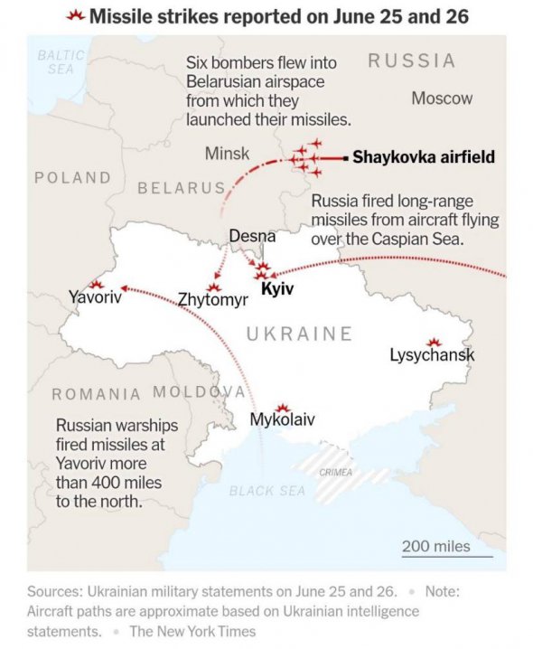 Американське видання The New York Times з посиланням на дані української розвідки, розмістило карту, де показано з яких напрямків і куди було завдано ракетних ударів по Україні 25-26 червня.