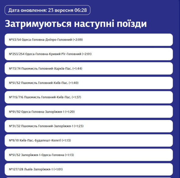 Внаслідок ворожого обстрілу та пошкодження інфраструктури в Кіровоградській області декілька поїздів прямують із затримками.