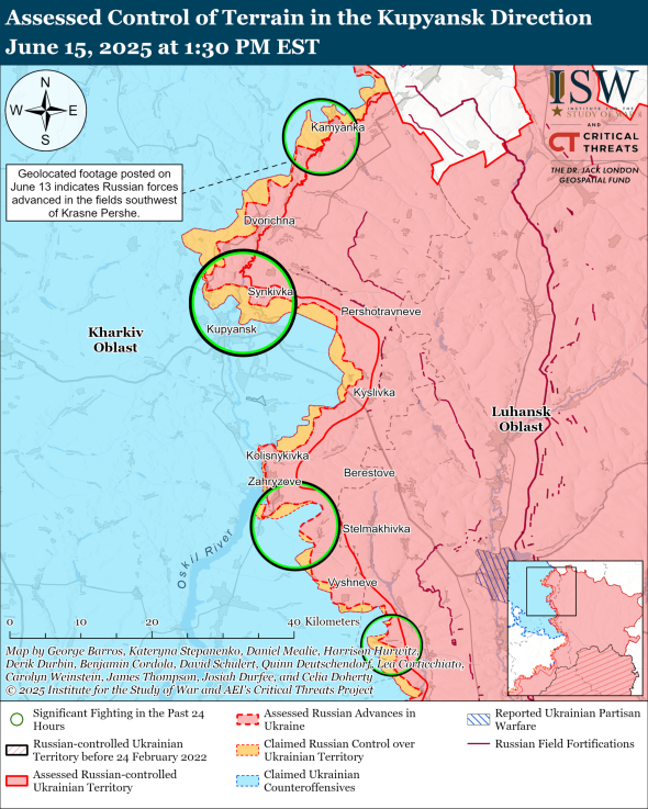 Загарбники, ймовірно, захопили додаткові позиції на західному березі річки Оскіл. Про це у звіті повідомив Американський Інститут вивчення війни ISW з посиланням на геолокаційні відеозаписи.