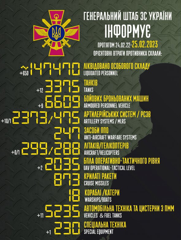 Загальні бойові втрати Росії на ранок 25 лютого становлять понад 147 470 осіб.