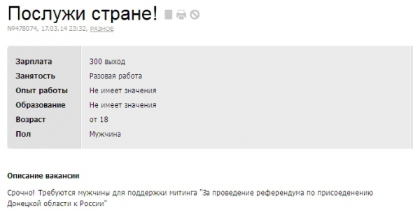 У Маріуполі на сайті з пошуку роботи набирають охочих "послужити країні" і взяти участь у мітингу "За проведення референдуму з приєднання Донецької області до Росії".