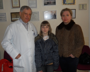 На знімку Еміль Фісталь з пацієнткою з Шотландії Емілі та її мамою Іриною Норей. У центрі комбустіології та пластичної хірургії ІНВХ ім. Гусака десятирічній Емілі звели до мінімуму рубці від опіку, отриманого в ранньому дитинстві. ФОТО автора