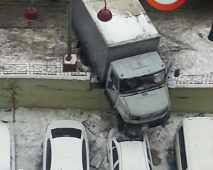 На Харківському шосе поблизу будинку №56 у Києві вантажівка вилетіла з дороги та повисла на бетонній огорожі.