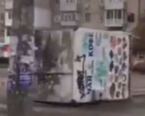 Будка з написом "Чай-кава-соки-води", яку везла у кузові вантажівка, почала завалюватися просто під час руху. Позаду, на відстані кількох метрів, рухався легковик. Водія врятувала швидка реакція: він встиг загальмувати, і ятка впала на капот машини, кермувальник не постраждав.
