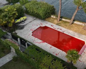 Червоною фарбою залиті басейн, будинок.