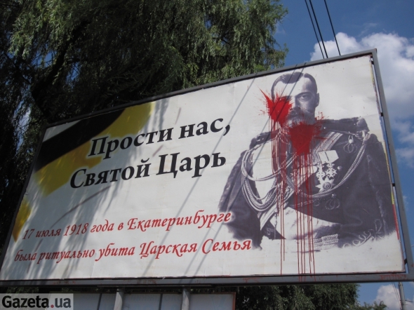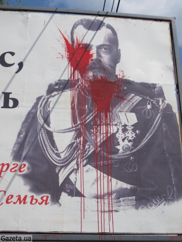 "Думаю, це зробили комуністи. Вони ще за часів перевороту називали царя "Кривавим". Тому і вибрали червону фарбу. Але головне, що вони не пошкодили сам напис. А портрет же має сакральний сенс. Плакат буде висіти до 28 липня, як і було заплановано. Навіть у червоній фарбі ми його раніше знімати не будемо", - додав козак Генадій Марченко.