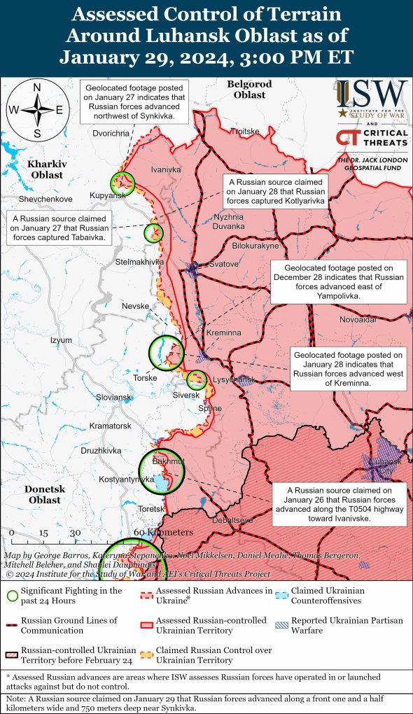 Геолокаційні кадри, опубліковані 28 січня, показують, що російські війська досягли незначного успіху в лісосмузі на схід від Ямполівки (на захід від Кремінної). Російські "воєнкори" також заявляли, що війська РФ нібито просунулися до Торського та Ямполівки.