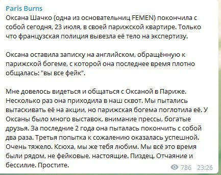 "Оксана наклала на себе руки 23 липня в своїй паризькій квартирі. Тільки що французька поліція вивезла її тіло на експертизу. Оксана залишила записку англійською, звернену до паризької богеми, з якої вона останнім часом щільно спілкувалася:" Ви всі - фейк", - йдеться у повідомленні на Telegram-каналі.
