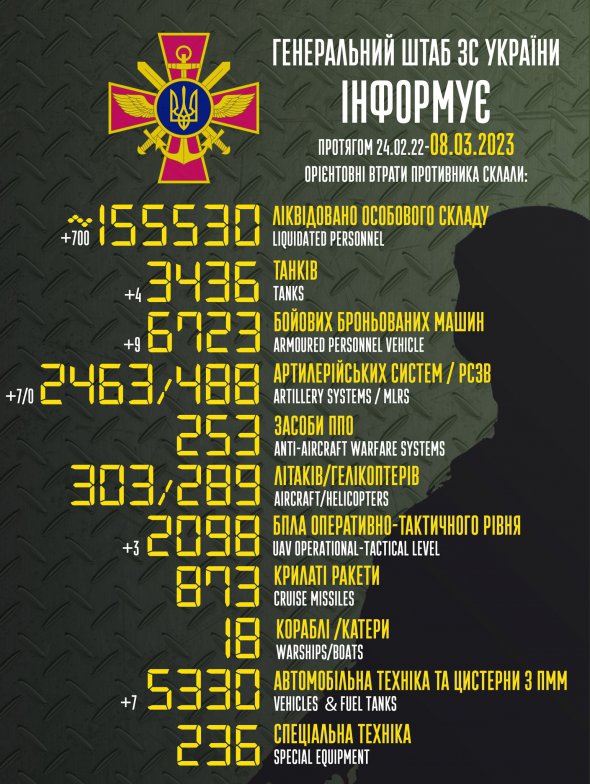 Загальні бойові втрати армії РФ від 24 лютого 2022-го по 8 березня 2023 року